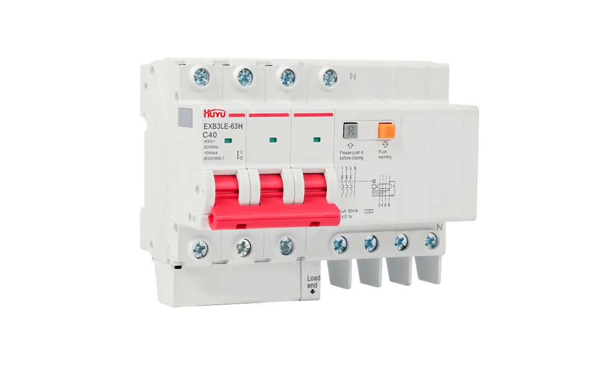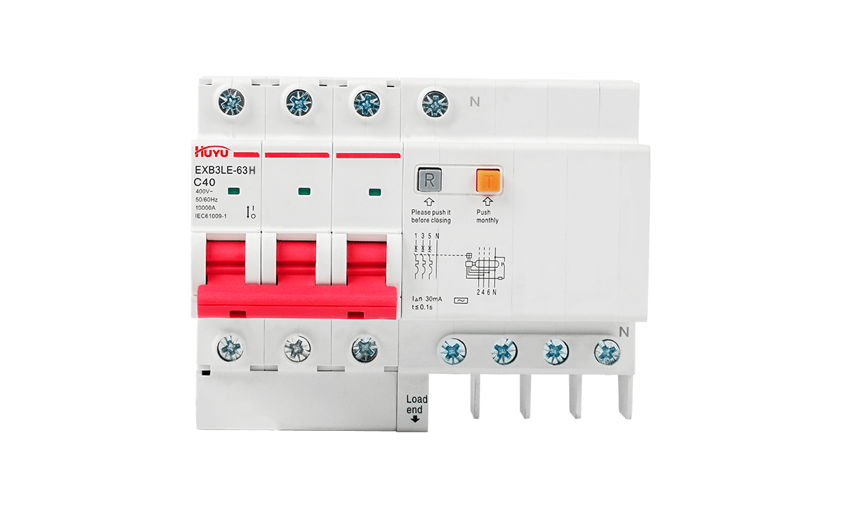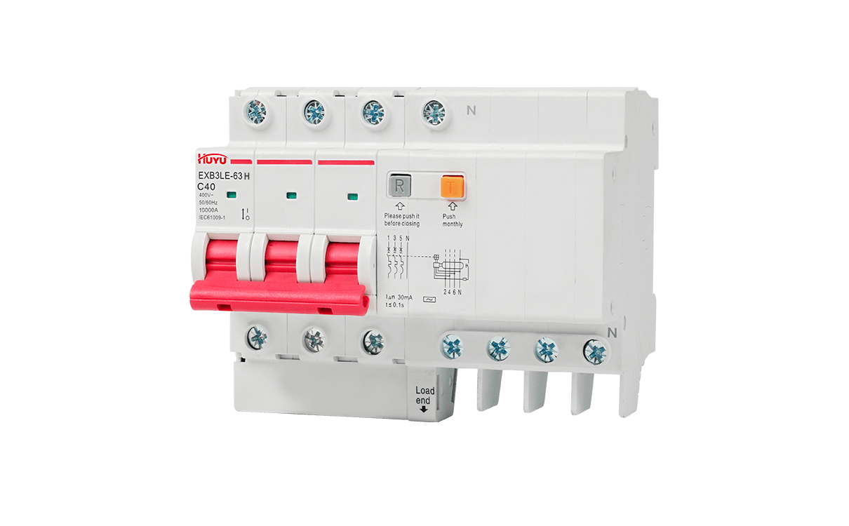 The EXB3LE-63H series residual current circuit breakers are suitable for the leakage and overload protection for the circuits with AC 50Hz, rated voltage up to 400V and rated current up to 63A, and for similar purposes, so as to prevent fire or casualty accidents caused by line leakage or electric shock, and also provide voltage protection for excessive voltage rise caused by power grid fault. Residual current operated circuit breakers 1P+N and 2P can specially produce residual current operated circuit breakers with overvoltage protection function. In addition to overload, short circuit and leakage protection functions, the circuit breaker can also protect the excessive voltage rise caused by power grid fault. (for example, the voltage rise caused by neutral line misconnection, disconnection and three-phase load imbalance).
