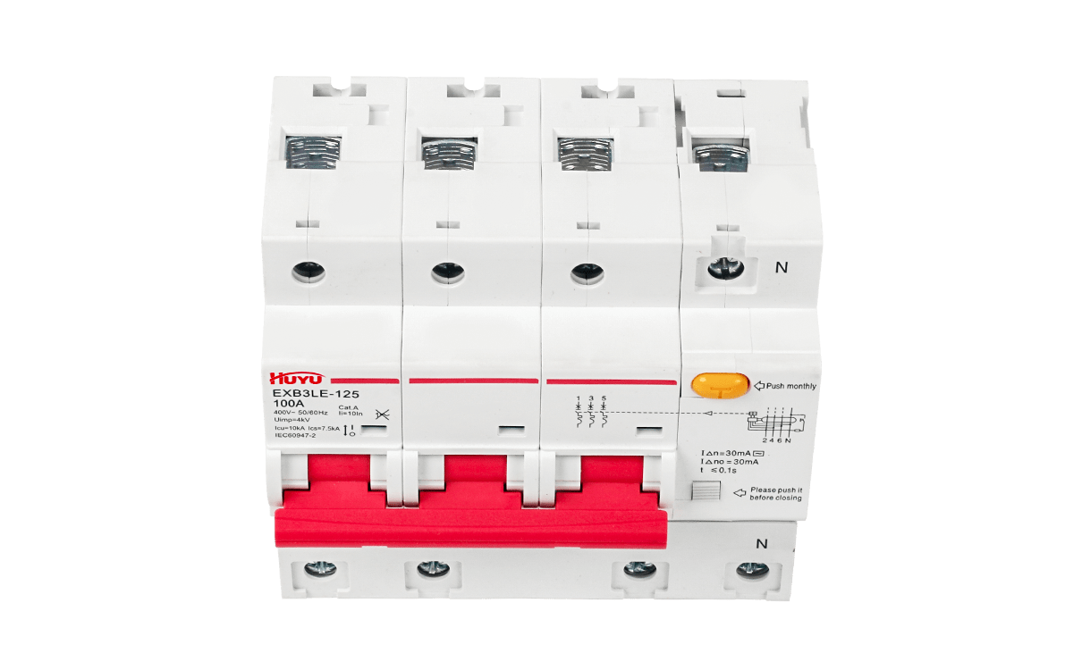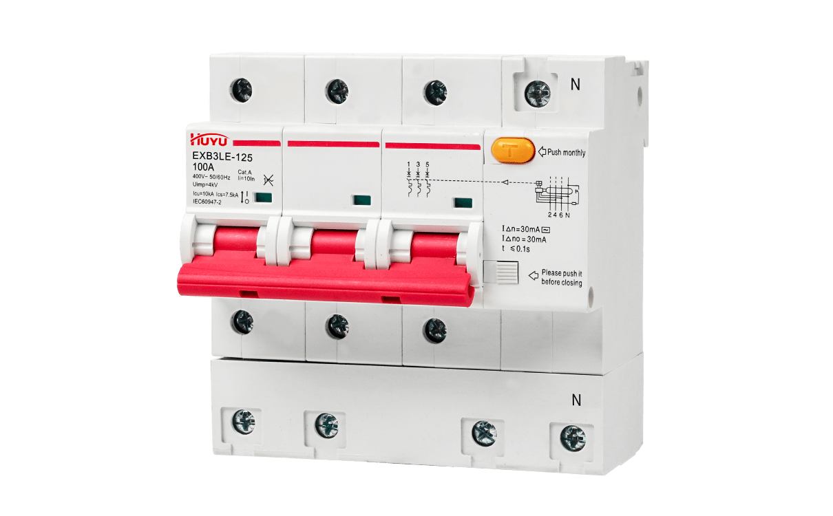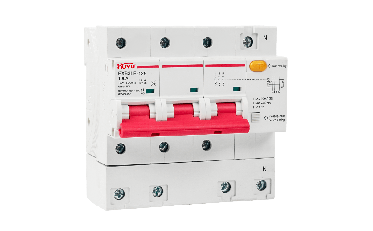 The EXB3LE-125 series Miniature Circuit Breaker (hereinafter referred to as “circuit breaker”) can be used in power facilities and electrical equipment circuit with AC 50Hz, rated voltage up to 400V, and rated current up to 125 A, to offer overload and short-circuit protection for overcurrent protection, and can be also used for the infrequent on-off control. The feature of signal controlling tripping can be available to satisfy special needs of long-distance controlling of breaking circuits or automatic signal controlling breaking. Nowadays, this feature is widely used together with IC card electricity meter to control the breaking of circuits.