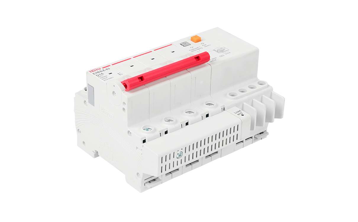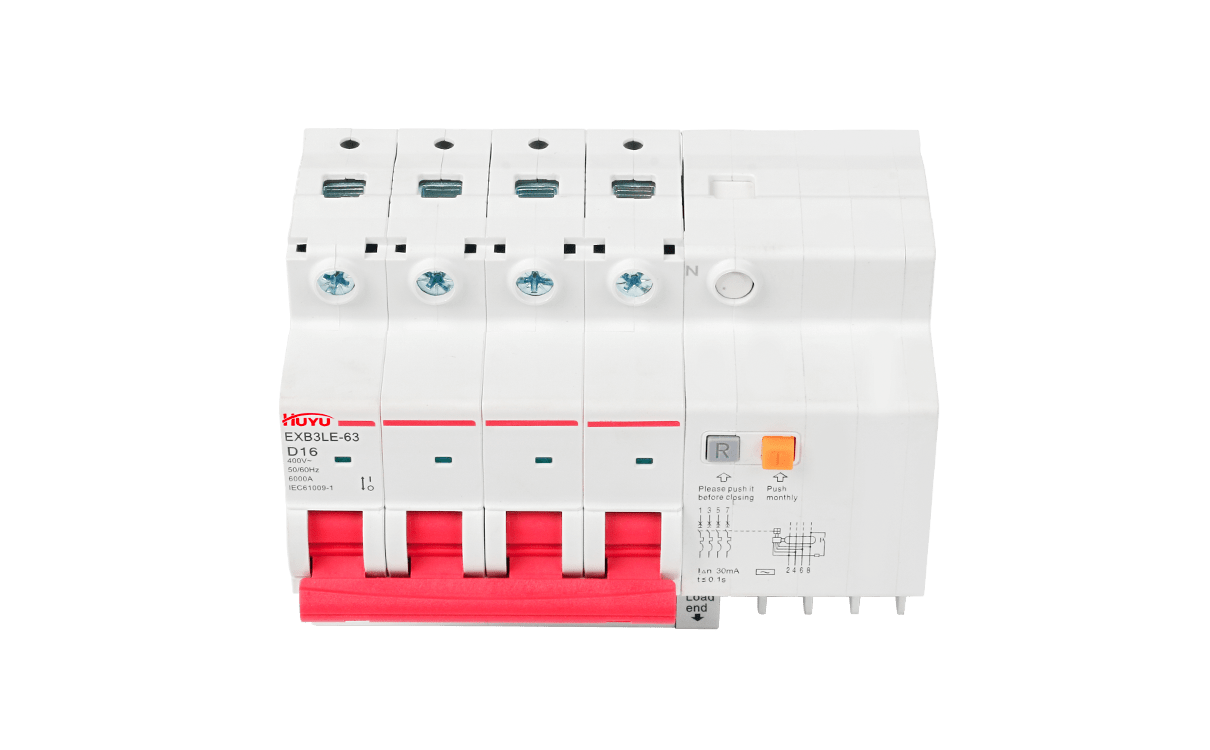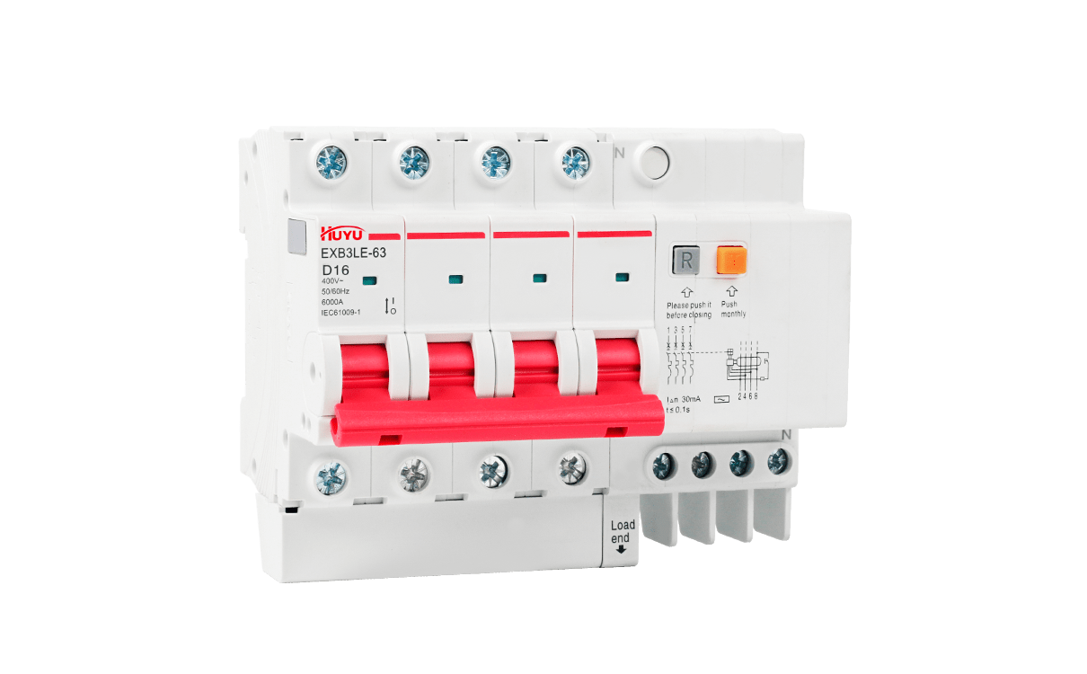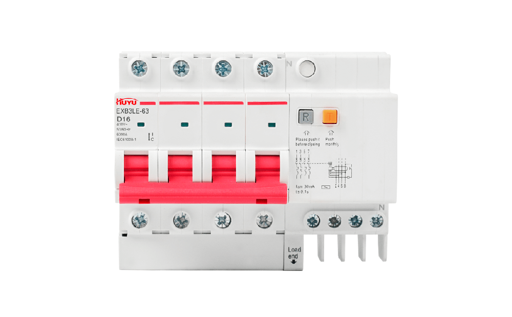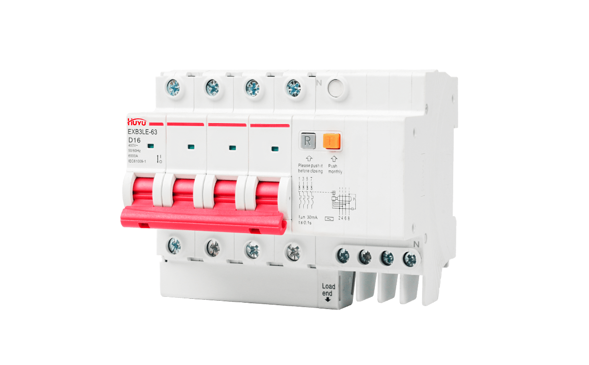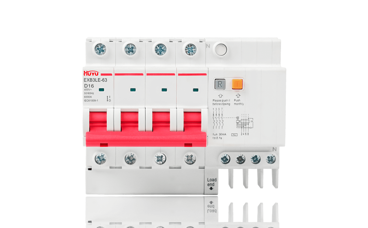 The EXB3LE-63 series residual current circuit breakers are suitable for the leakage and overload protection for the circuits with AC 50Hz, rated voltage up to 400V and rated current up to 63A, and for similar purposes, so as to prevent fire or casualty accidents caused by line leakage or electric shock, and also provide voltage protection for excessive voltage rise caused by power grid fault. Residual current operated circuit breakers 1P+N and 2P can specially produce residual current operated circuit breakers with overvoltage protection function. In addition to overload, short circuit and leakage protection functions, the circuit breaker can also protect the excessive voltage rise caused by power grid fault. (for example, the voltage rise caused by neutral line misconnection, disconnection and three-phase load imbalance).